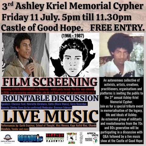 On 9 July 1987, at the age of 20, working-class revolutionary militant and community leader, Ashley Kriel, was assassinated by apartheid security forces. In remembrance of his convictions of leadership and the contribution that youth across South Africa played in the struggle against apartheid, the co-constructors will host the 3rd annual memorial lecture. This year, the cypher is hosted in venue partnership with the Castle of Good Hope.
